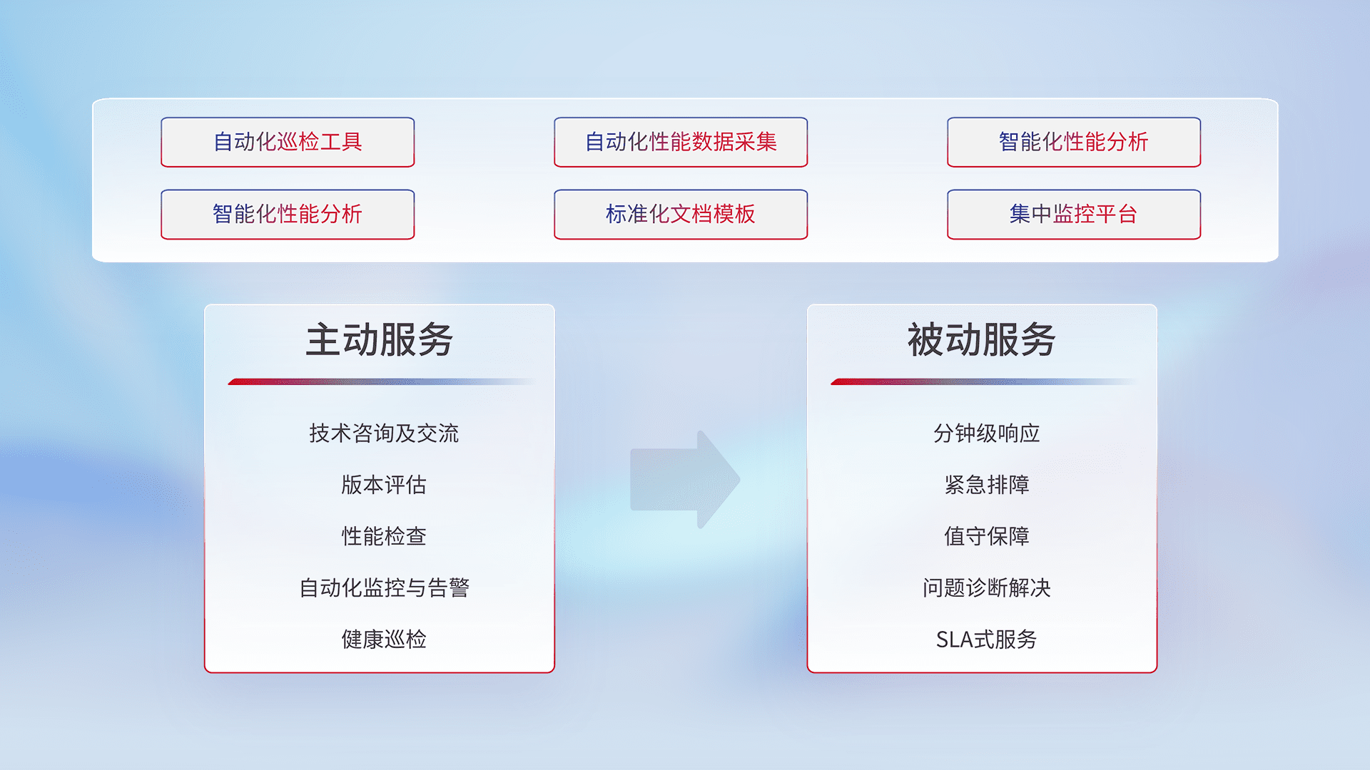智能化工具和标准化文档,,,保障服务质量,,提供主动服务(包含技术咨询、、版本评估、、、性能检查、、自动化监控与告警、、、、健康巡检)和被动服务包含(分钟级响应、、紧急排障、、值守保障、、、、问题诊断解决、、SLA服务)。。。。